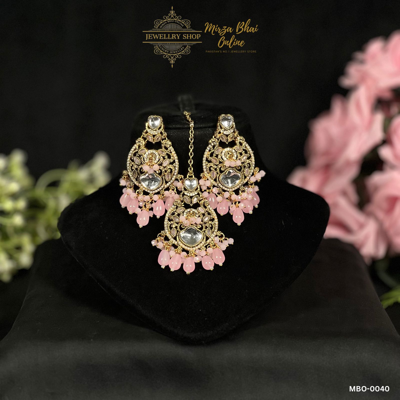 - Brass based, resin plated earrings and teeka set with sheesha stones and pearl drops.