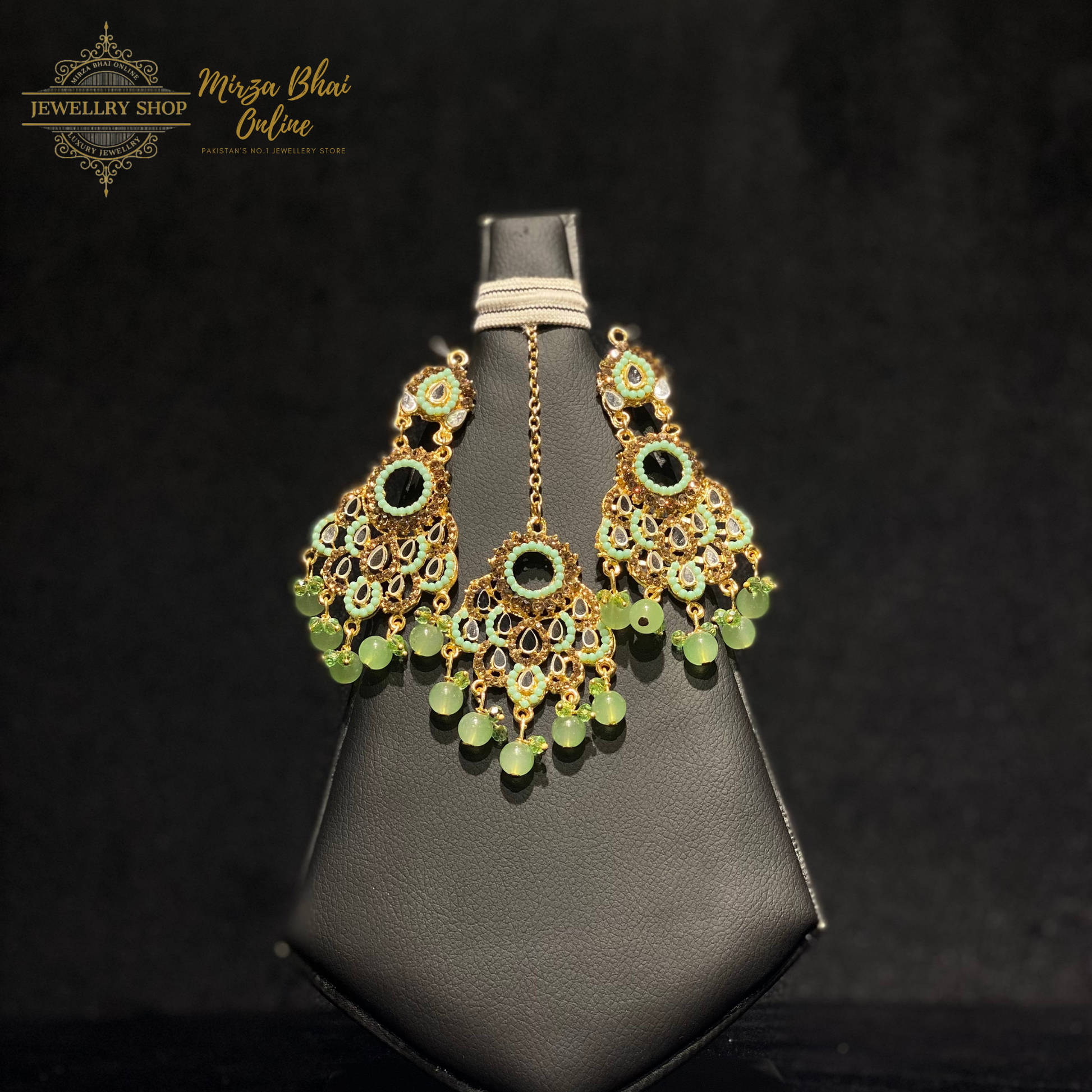 - Brass based, resin plated earrings and teeka set with sheesha stones and pearl drops.