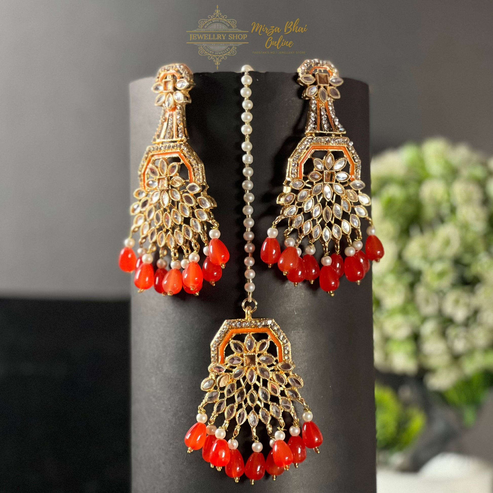 - Brass based, resin plated earrings and teeka set with sheesha stones and pearl drops.