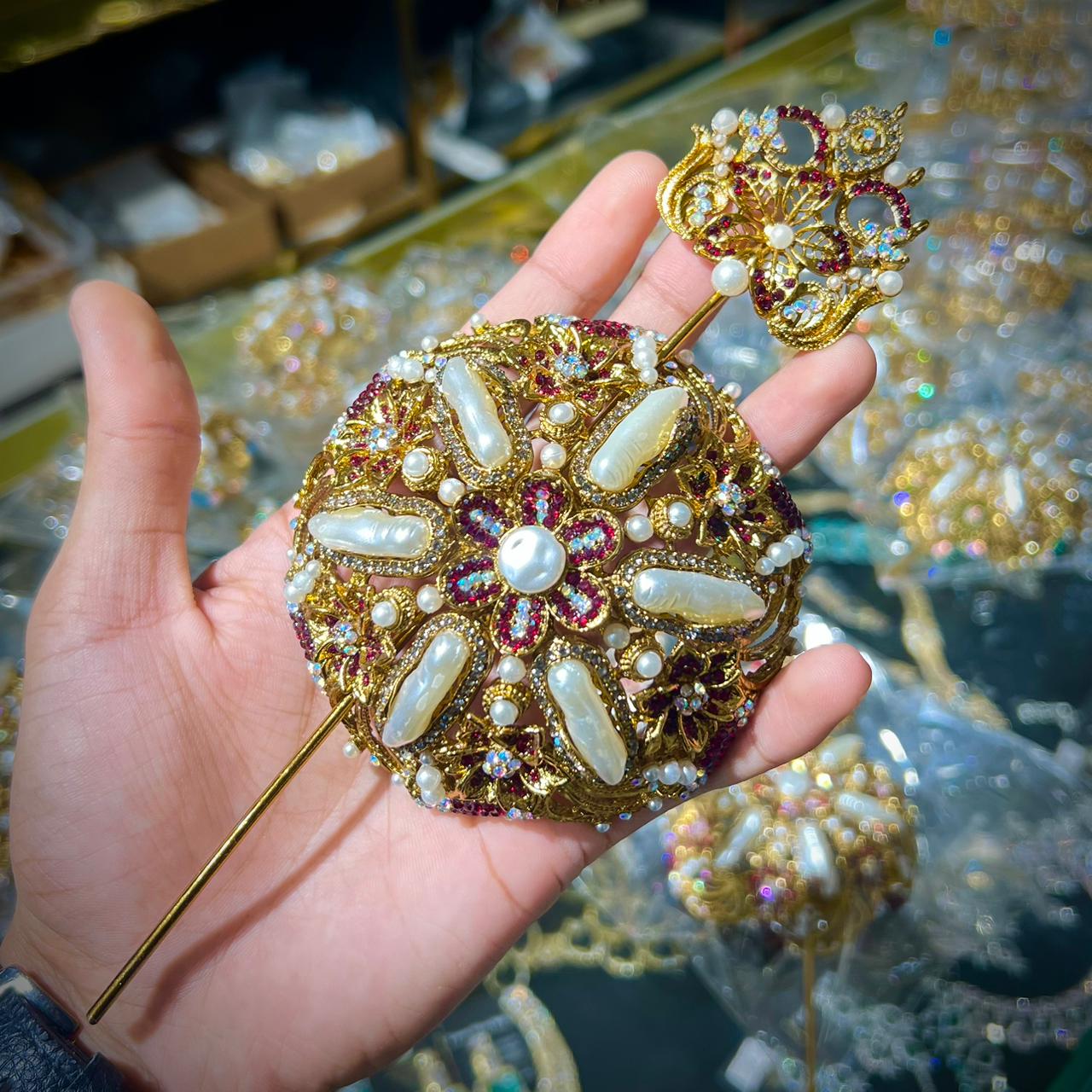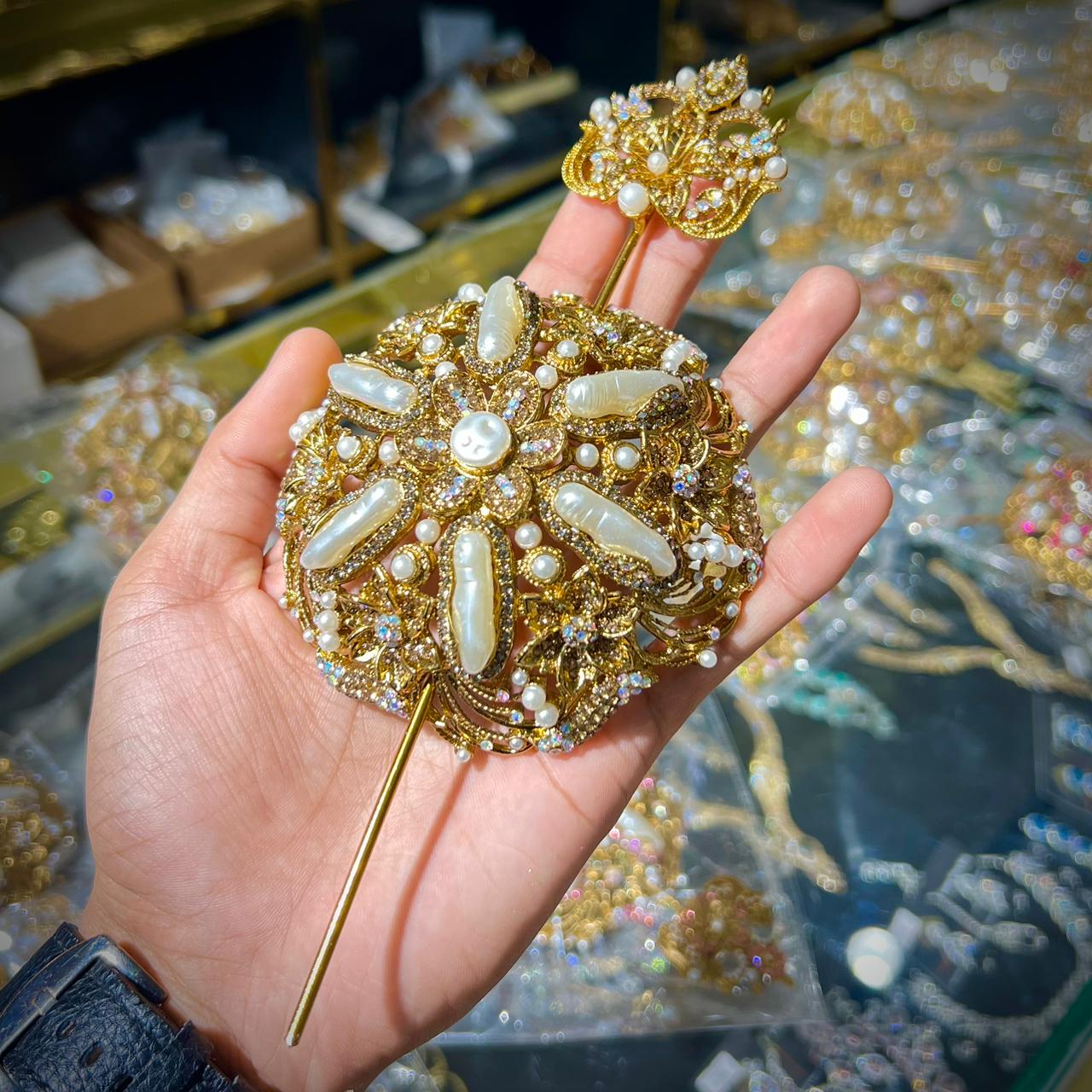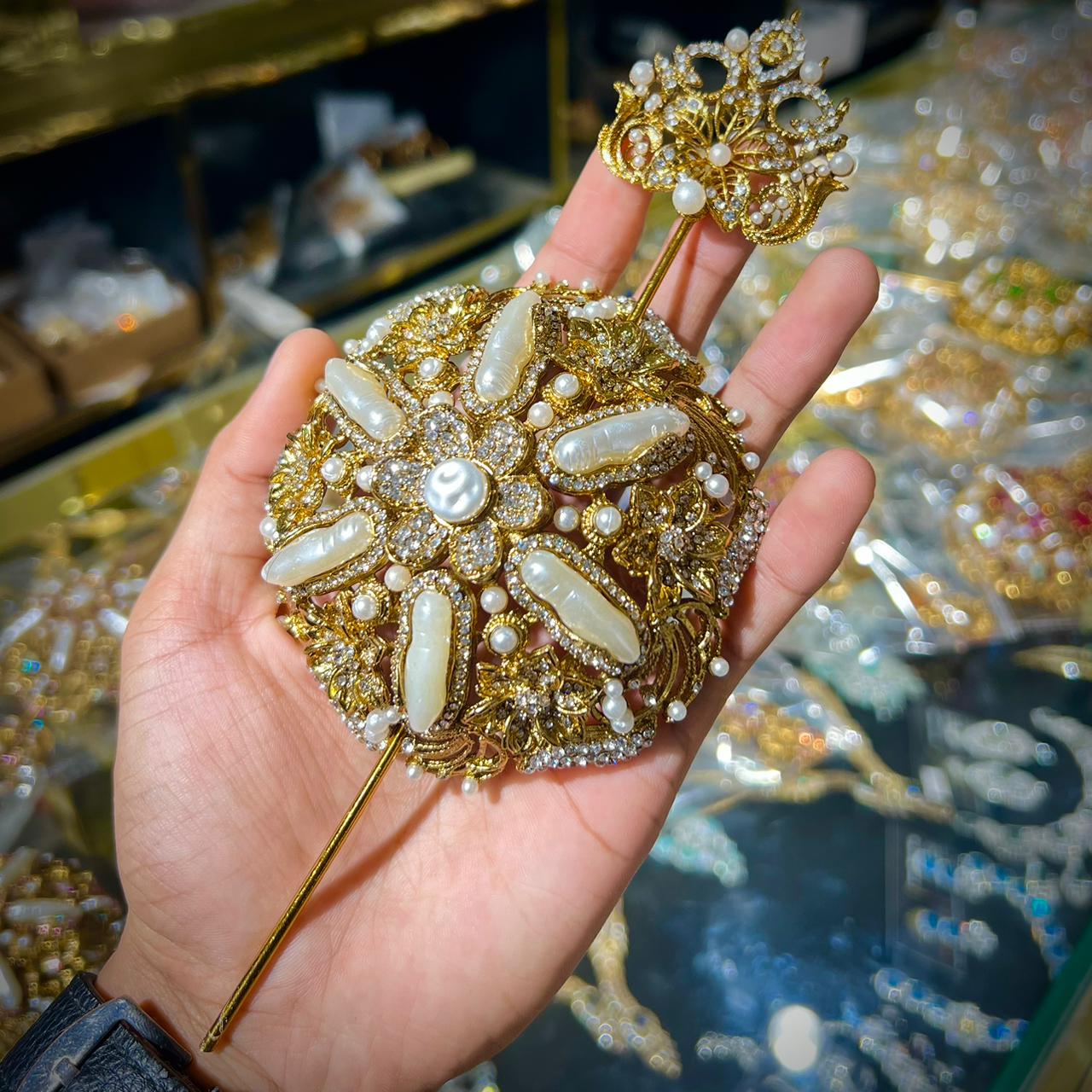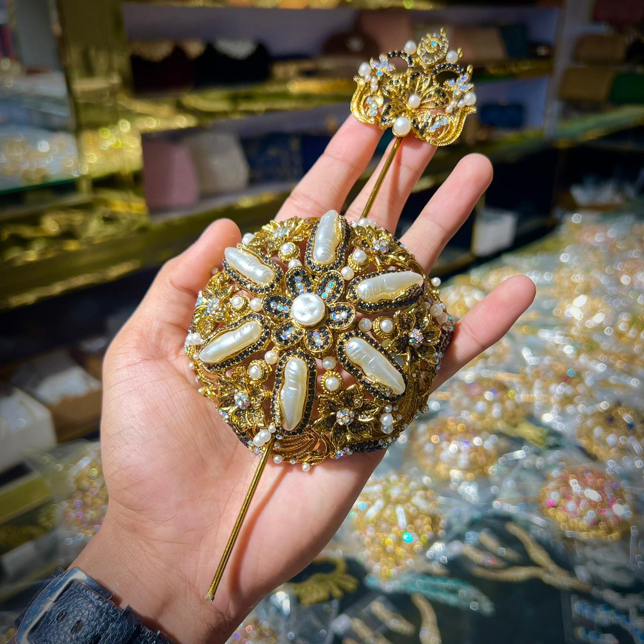 “This is a fine piece of art with its fusion of tradition and royalty. It is made on a golden ground, and is perfectly embellished with fine pearls, and glittering blue jewels, and intricate white ornaments, in a natural flowery design. Its luxurious finish and fine detailing makes it a special accessory which only embellishes any hairstyle. This hair juda is suitable in weddings, bridal hairstyles, wedding parties and other celebrations by giving it a touch of class and eternal loveliness. The design, which is Turkish inspired, introduces an exclusive mix of traditionalism and the glamour of modernity and thus is a must-have accessory to all occasions that are special.”