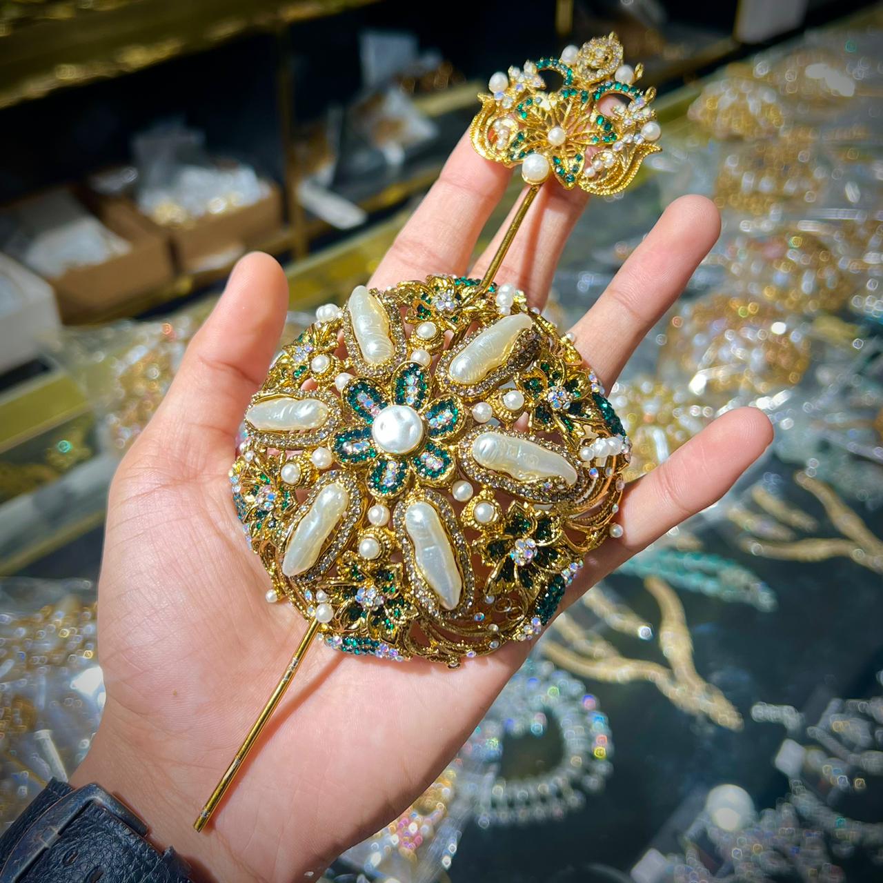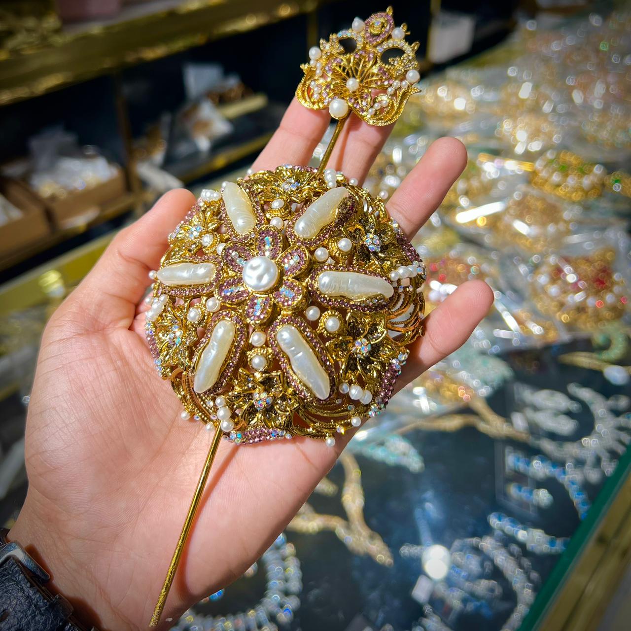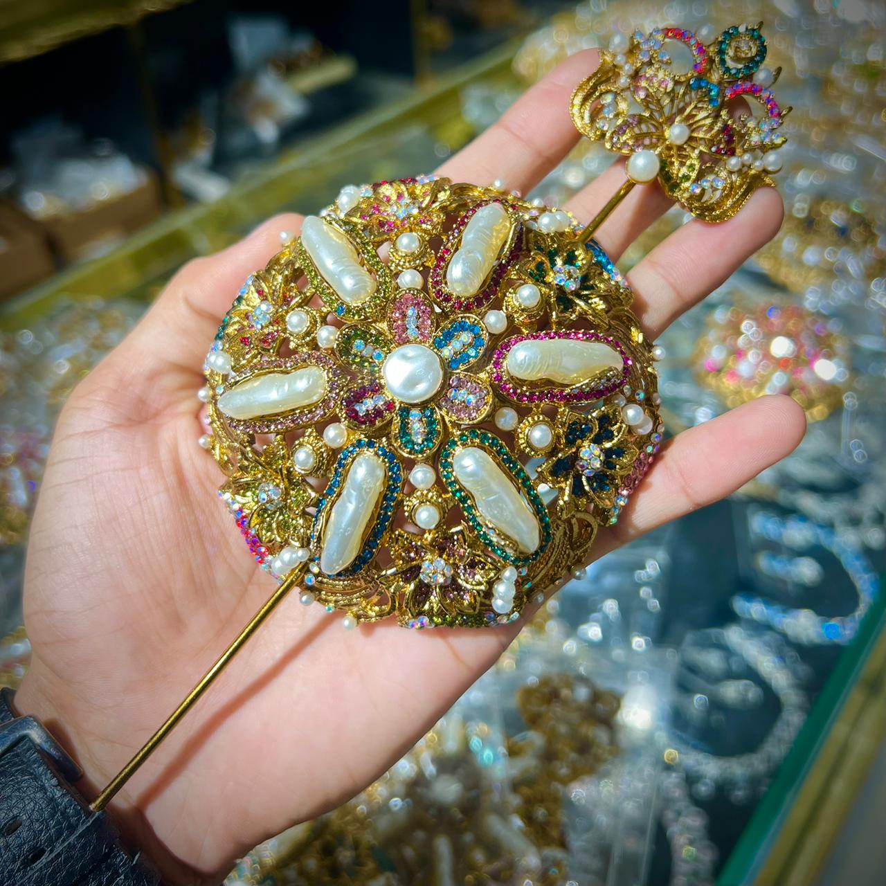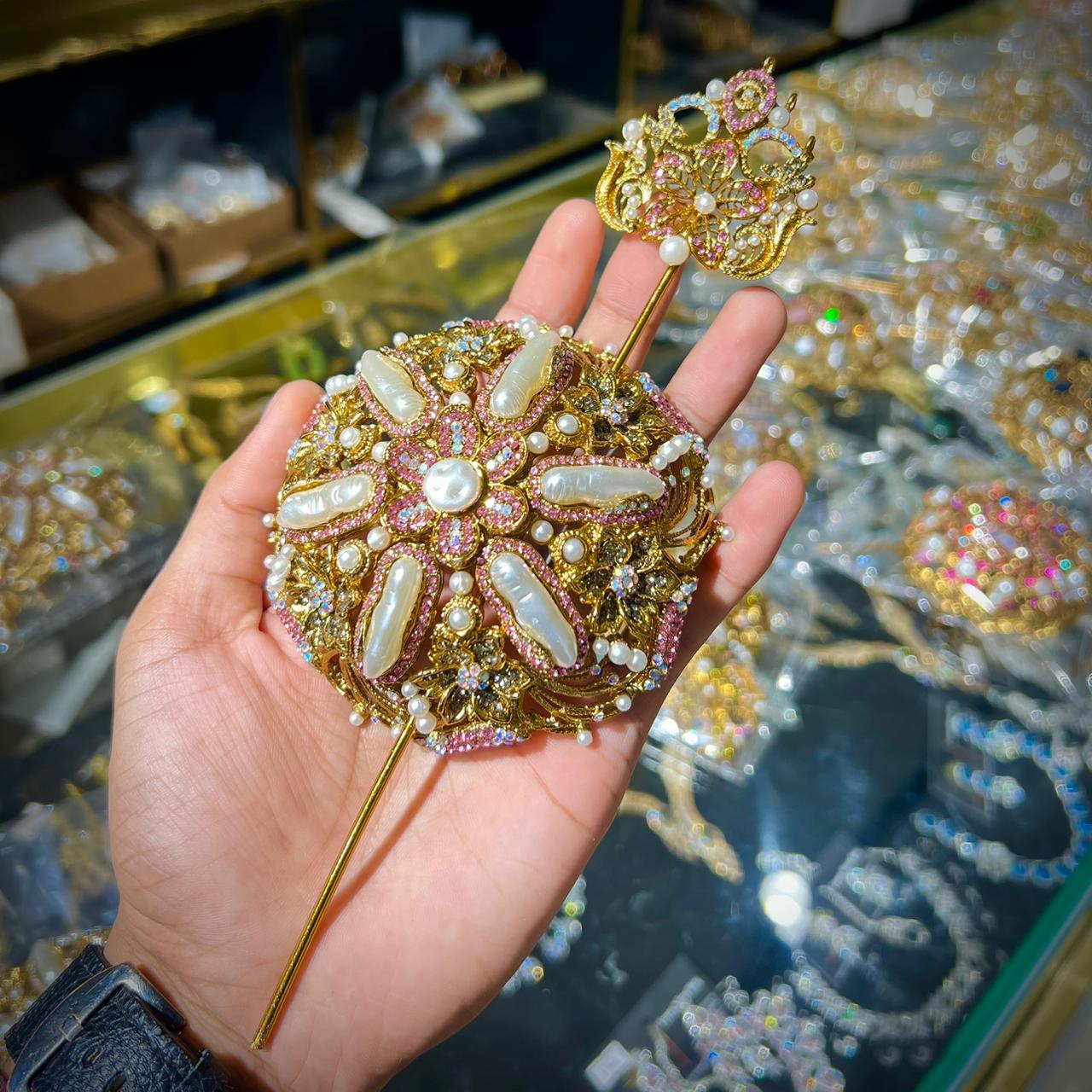“This is a fine piece of art with its fusion of tradition and royalty. It is made on a golden ground, and is perfectly embellished with fine pearls, and glittering blue jewels, and intricate white ornaments, in a natural flowery design. Its luxurious finish and fine detailing makes it a special accessory which only embellishes any hairstyle. This hair juda is suitable in weddings, bridal hairstyles, wedding parties and other celebrations by giving it a touch of class and eternal loveliness. The design, which is Turkish inspired, introduces an exclusive mix of traditionalism and the glamour of modernity and thus is a must-have accessory to all occasions that are special.”