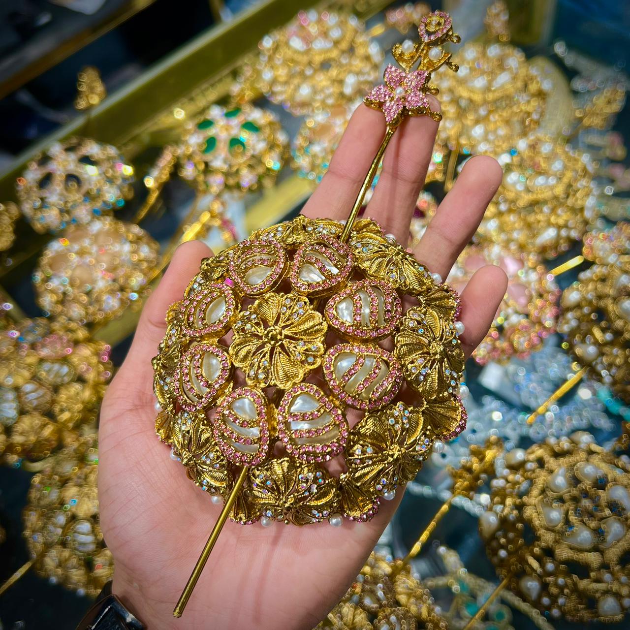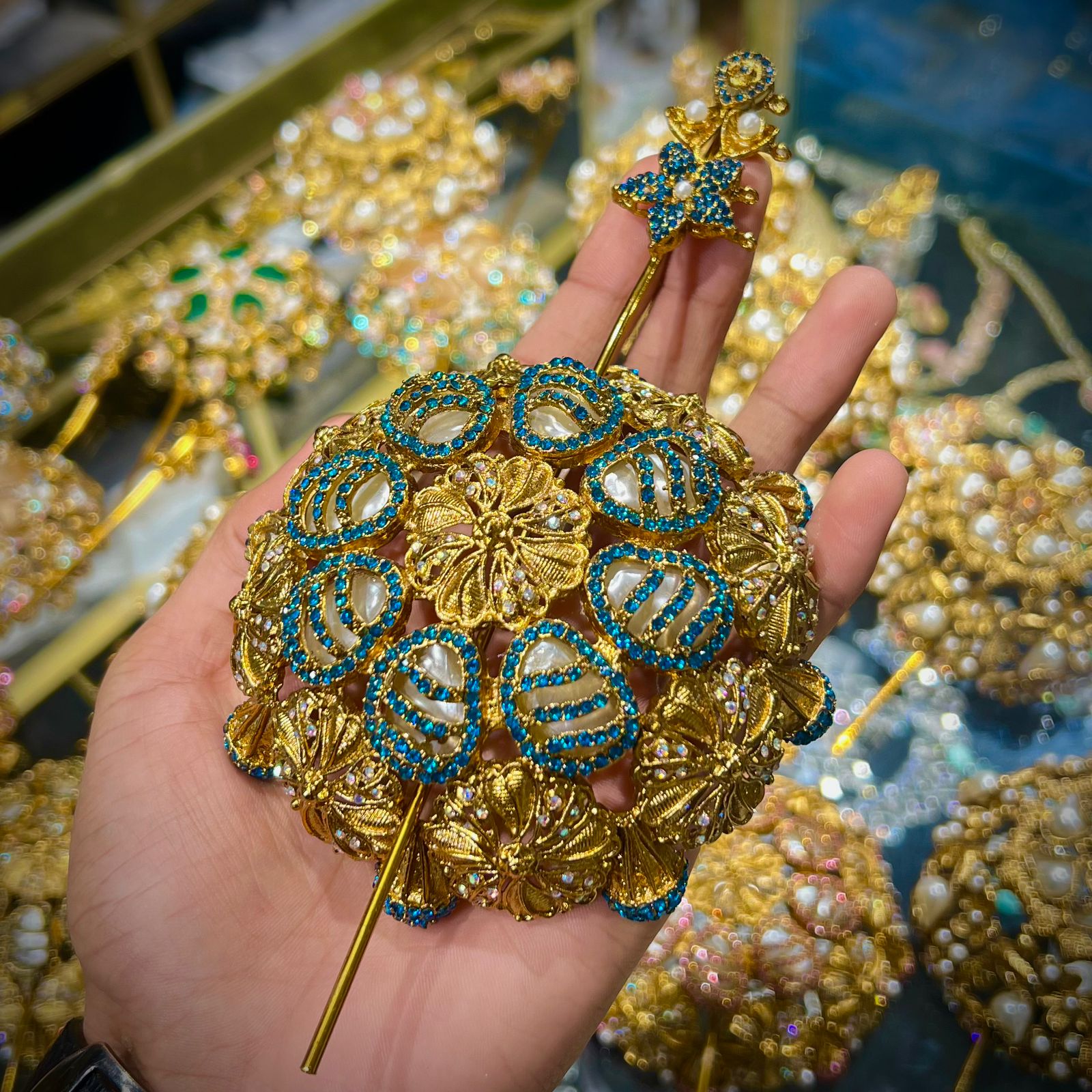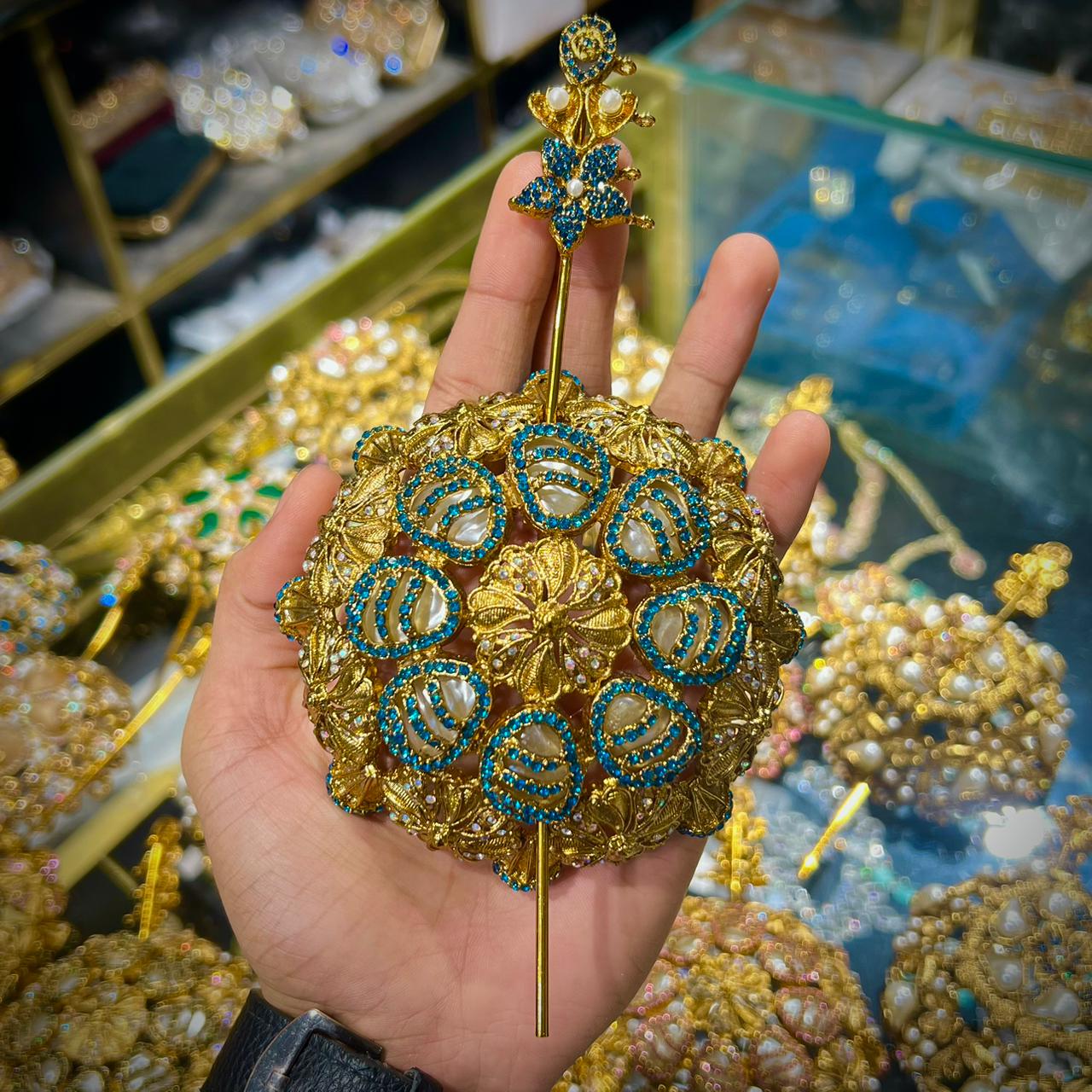 “This is a fine piece of art with its fusion of tradition and royalty. It is made on a golden ground, and is perfectly embellished with fine pearls, and glittering blue jewels, and intricate white ornaments, in a natural flowery design. Its luxurious finish and fine detailing makes it a special accessory which only embellishes any hairstyle. This hair juda is suitable in weddings, bridal hairstyles, wedding parties and other celebrations by giving it a touch of class and eternal loveliness. The design, which is Turkish inspired, introduces an exclusive mix of traditionalism and the glamour of modernity and thus is a must-have accessory to all occasions that are special.”