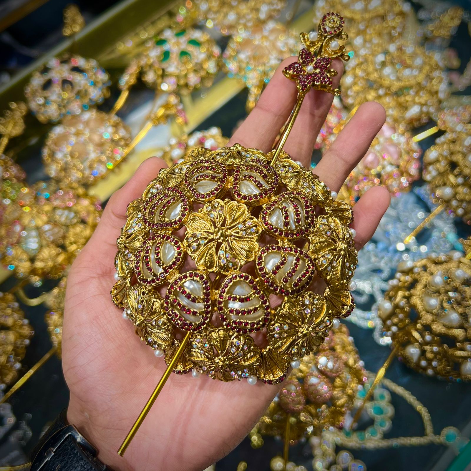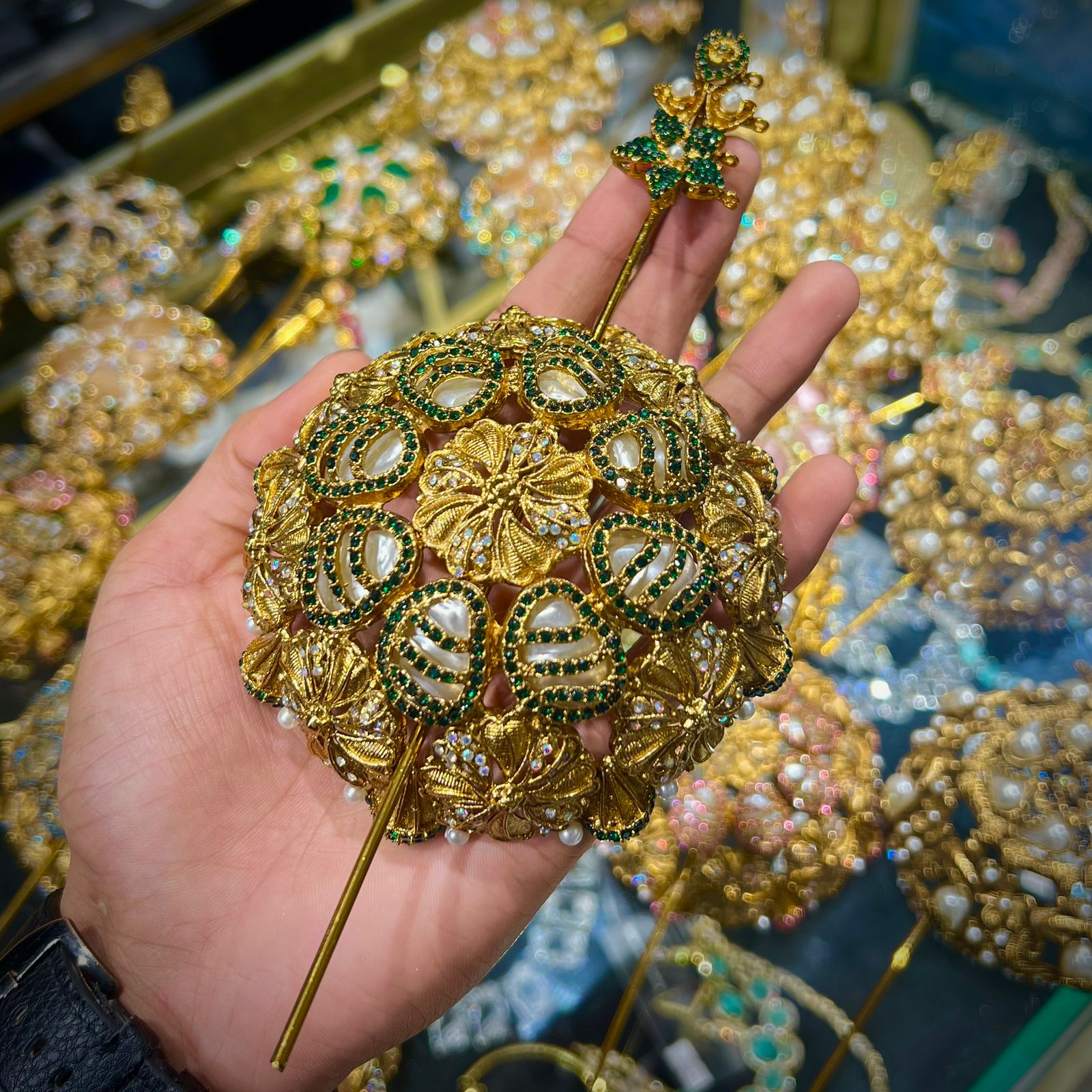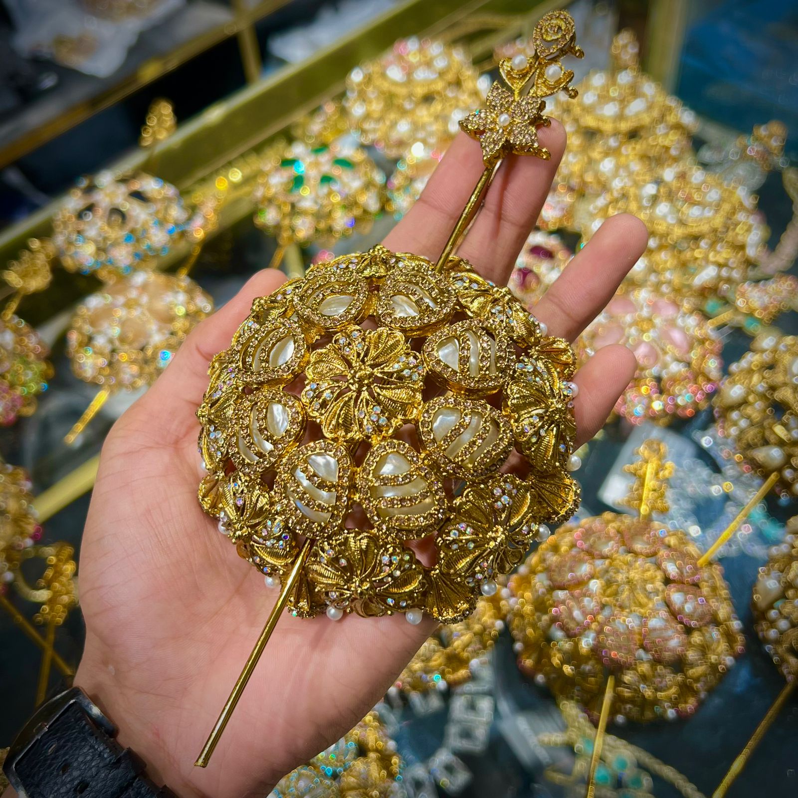 “This is a fine piece of art with its fusion of tradition and royalty. It is made on a golden ground, and is perfectly embellished with fine pearls, and glittering blue jewels, and intricate white ornaments, in a natural flowery design. Its luxurious finish and fine detailing makes it a special accessory which only embellishes any hairstyle. This hair juda is suitable in weddings, bridal hairstyles, wedding parties and other celebrations by giving it a touch of class and eternal loveliness. The design, which is Turkish inspired, introduces an exclusive mix of traditionalism and the glamour of modernity and thus is a must-have accessory to all occasions that are special.”